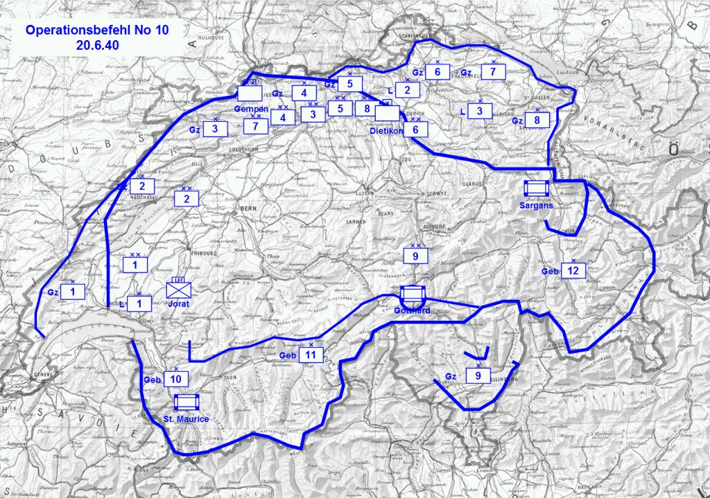 Just prior to the total French collapse, General Guisan issued Operationsbefehl Number 10, which representaed a complete overhaul of existing Swiss defensive plans. With the country now essentially surrounded, Op. Bef. 10 signaled a drastic shift in priorities. The weak state of the Swiss Army through the 1930’s rendered incapable of meaningful resistance on its own. Therefore, a secret liaison with the French General Staff had been established, which arranged for French troops to defend Swiss soil in the event of a simultaneous strike on the two countries. With France out of the picture, so were these plans.