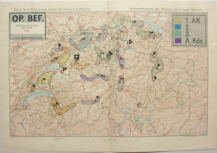 The first assigned the existing three army corps to the east, north, and west, with reserves in the center and south of the country.[12] Guisan reported to the Federal Council on September 7 that by the moment of the British declaration of war, “our entire army had been in its operational positions for ten minutes.” He also had his Chief of the General Staff increase the service eligibility age from 48 to 60 years old (men of these ages would form the rear-echelon Landsturm units), and ordered the formation of an entirely new army corps of 100,000 men.[13]