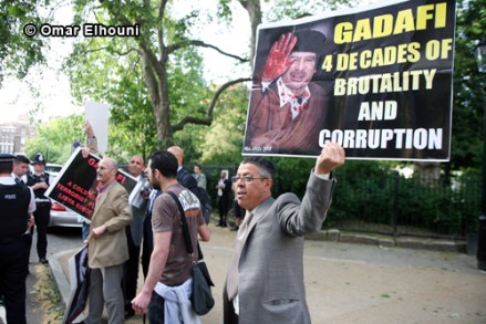 Libyan men protest the Gaddafi regime at the London School of Economics, May 26, 2010.