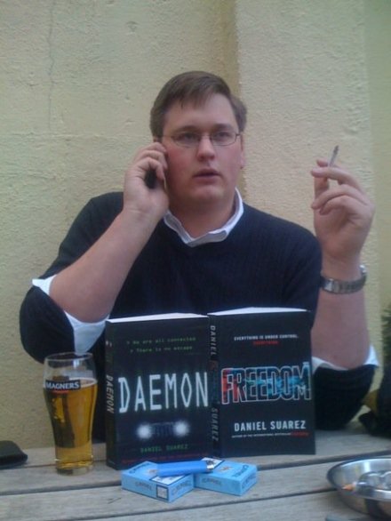 After hearing praise from my various luminaries like John Robb, Shlok Vaidya, and zenpundit, there’s no way I could not read Daniel Suarez’s Daemon. The tagline reads “Michael Crichton for the information age,” and in virtually all aspects the book lives up to such a lofty claim.